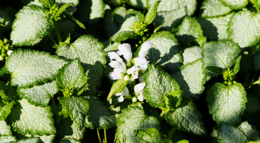 Народное название – глухая крапива. Один из самых распространенных видов, характеризуется белыми цветками, собранными в плотные мутовки. Листья крупные, зубчатые, покрыты мягкими волосками (в отличие от настоящей крапивы, они не жгучие). Растение высокое до 60 см в благоприятных условиях. Образует густые заросли. Цветет в мае и повторно в сентябре. Отличается неприхотливостью и теневыносливостью, часто встречается в лесах и на опушках. Применяется в народной медицине как кровоостанавливающее растение
