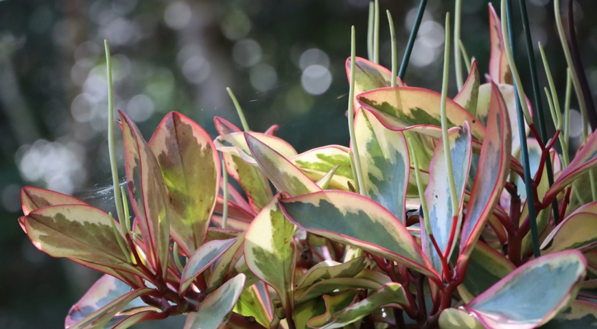 Пеперомия клузиелистная (Peperomia clusiifolia) — листья плотные, крупные, овальные, вариегатные, с красноватым краем.