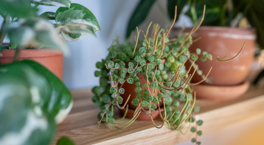 Пеперомия стелющаяся (Peperomia prostrata) — ампельное растение. Стелющиеся побеги с маленькими круглыми листьями, выращивается в подвесных кашпо.