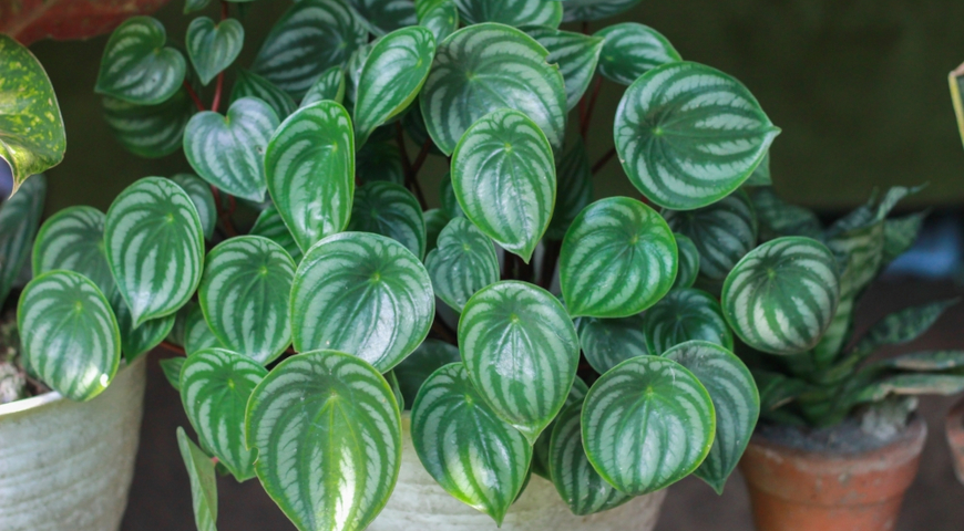 Пеперомия арбузная (Peperomia argyreia, Watermelon Peperomia) — листья с характерным рисунком, напоминающим полосы на арбузе. Costa Rica (миниатюрное растение с розовато-бордовой изнанкой листьев), Harmony's Gold Dust Women (вариегатная).
