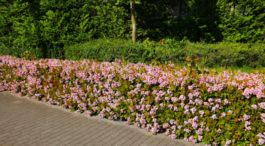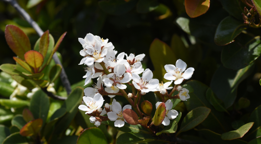 Ballerina (Rhaphiolepis indica)– отличается пышным цветением и аккуратной формой куста, цветки белые.