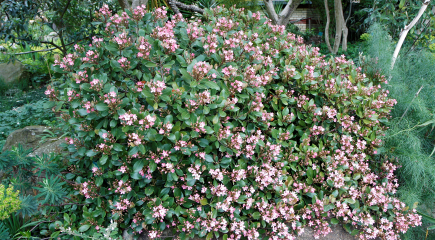 Рафиолепис индийский (Rhaphiolepis indica): Наиболее распространенный вид с розовыми или белыми цветками, густой листвой.