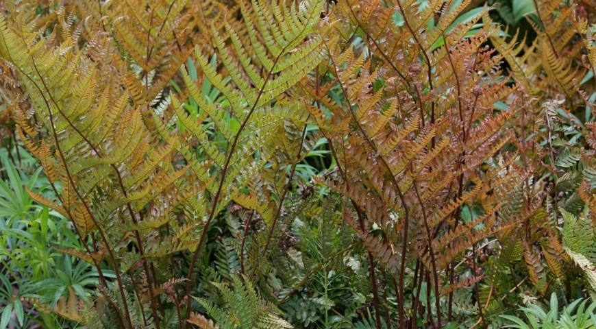 Щитовник родственный (Dryopteris affinis) — обладает блестящими листьями с хорошо заметными чешуями, устойчив к холодам.