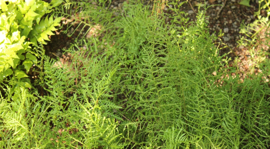 Щитовник гребенчатый (Dryopteris cristata) – листья светло-зеленые, дважды перисторассеченные, кожистые, с длинными черешками. Высотой около 30-50 см.