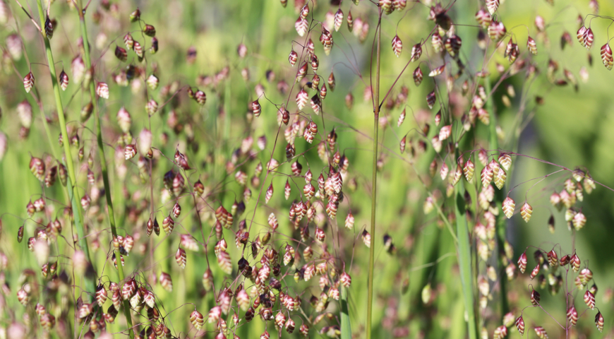 Трясунка хорошо смотрится в миксбордерах с многолетниками: эхинацеей, шалфеем, лавандой и декоративными злаками (мискантусом). Благодаря легкости и подвижности соцветий она добавляет динамику композициям.