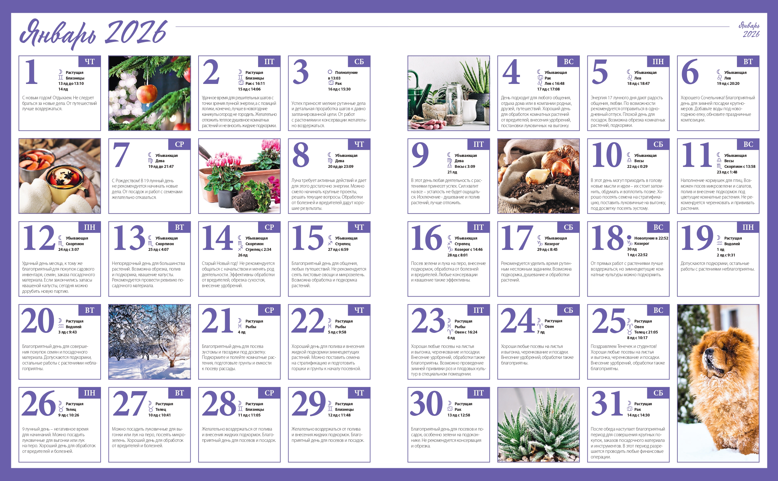 Лунный посевеной календарь на январь 2026 года на каждый день