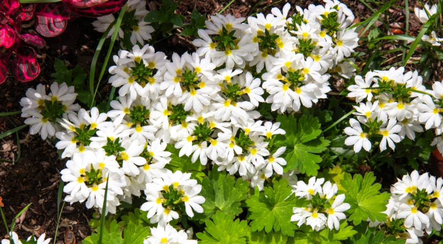 Новинка в серии почвопокровных и контейнерных растений Scala; устойчива к жаре и засухе. Цветки белые, веерообразные, хорошо разветвленные, куст среднерослый, прямостоячий, отлично подходит для контейнеров. От видового растения отличается плотной формой роста, компактностью и симметричным, выровненным цветением.