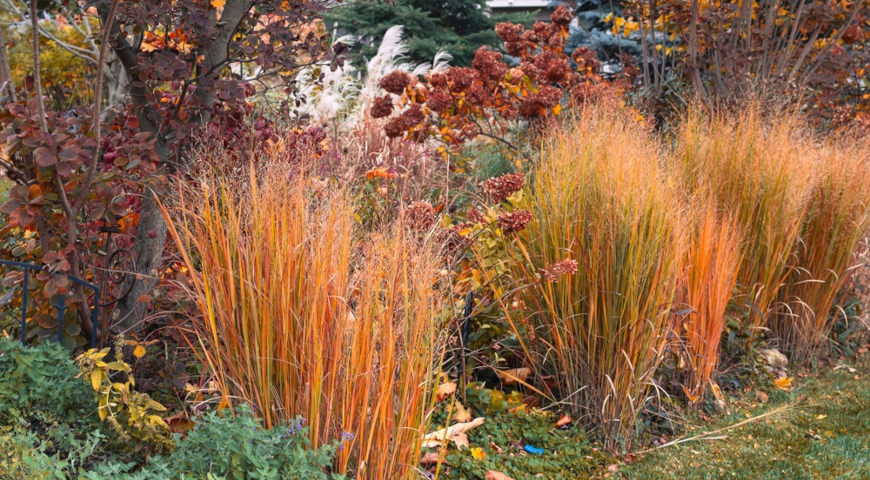 Просо прутьевидное (Panicum virgatum) гортензия метельчатая осенью
