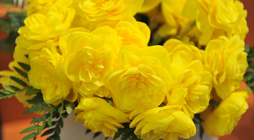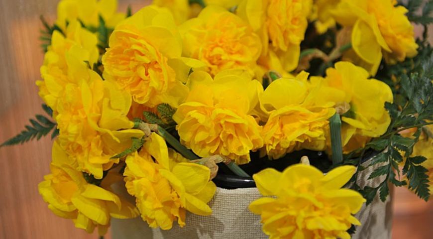 Цветок округлый махровый, гармоничный, диаметром 108 мм, обращен вверх; околоцветник и другие лепестковидные доли собраны в нескольких мутовках, красиво и равномерно расположены друг над другом, гладкие, ярко-желтые. Внешние мутовки распростертые, плоские, с загнутыми внутрь кончиками. Внутренние доли немного уже; внутренние мутовки становятся последовательно короче и сильнее загнуты к центру. Доли венчика очень короткие, перемежающиеся с внутренними долями околоцветника.